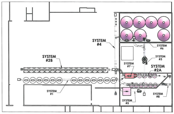 System CV2B 158 ft circuit length(4) 90 degree 60″ CLR elbows(2) 45 degree 48″ CLR elbows(2) pneumatic rotary discharges(1) inlet |