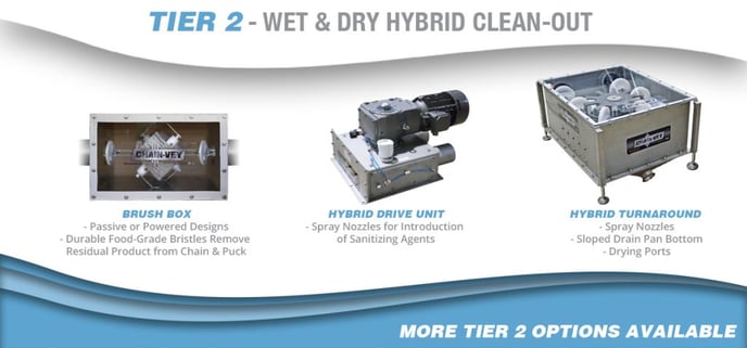 Dry Cleanout, Tier 1, is designed for dry applications with frequent conveyor changeovers of similar type products. Without the use of any liquid or cleaning agents, residual material accumulation and large particle cross contamination are eliminated with the use of a variety of Chain-Vey CIP options including: