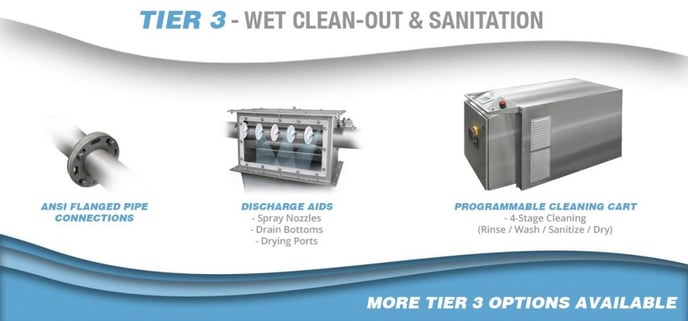 Wet & Dry Hybrid Cleanout, Tier 2, is developed to integrate with existing plant CIP processes/Skid or MPE’s supplied standalone cleaning units. Designed for dry products and ingredients with strong flavorings, colors or coating profiles that may leave residual materials in conveying system, by facilitating the introduction of water, foam and/or approved cleaning agents. Sanitizing options are available. Tier 2 options include: