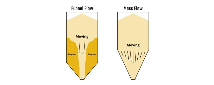 A visual representation of funnel vs mass flow.Another issue resulting from funnel flow is sifting segregation. Sifting segregation is where smaller beans move at different velocities than larger beans during discharge. For bean blends this is highly undesirable. Even for single lot coffee processing, sifting segregation introduces another variable in the way of product consistency. The illustration below shows sifting segregation in action: