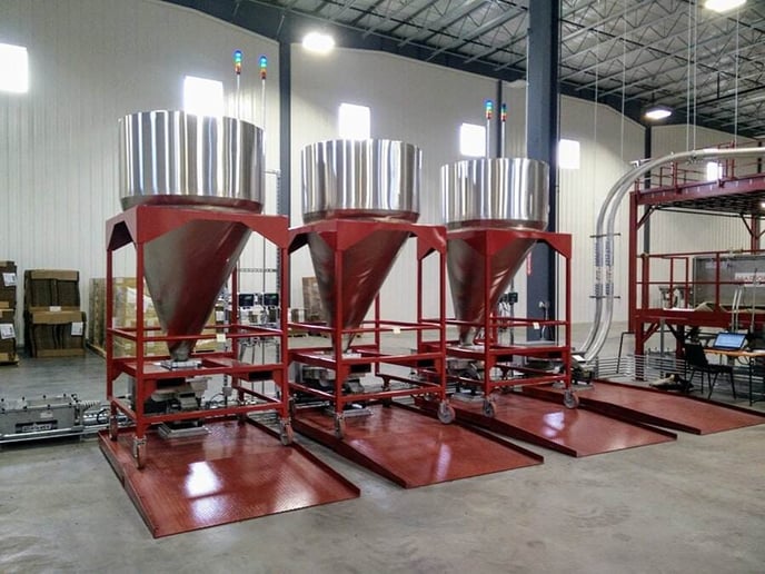 Surge bins installed on a mezzanine serve to hold (whole bean) coffee prior to grinding and then hold (ground) coffee prior to discharge into mobile totes.Surge bins provide a flexible way to temporarily hold and regulate the flow of coffee through each process. An operator only has to run one process at a time which saves on energy consumption and equipment wear. Also, as depicted in the system above, an operator can grind coffee while mobile totes are being used elsewhere.