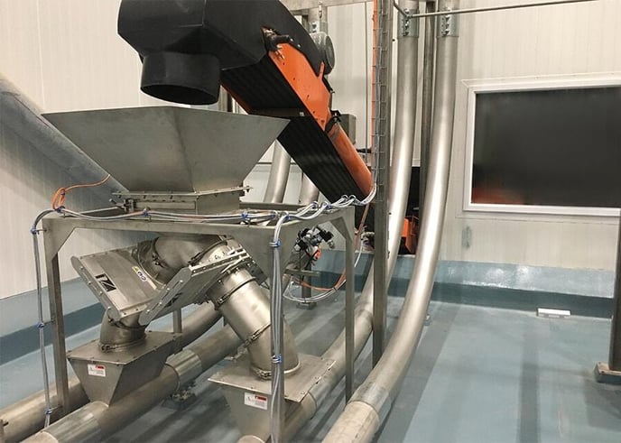 At the bottom of each silo is a three way diverter valve that directs the flow of beans to any of three silo unloading conveyor.Blancher Loading Conveyor