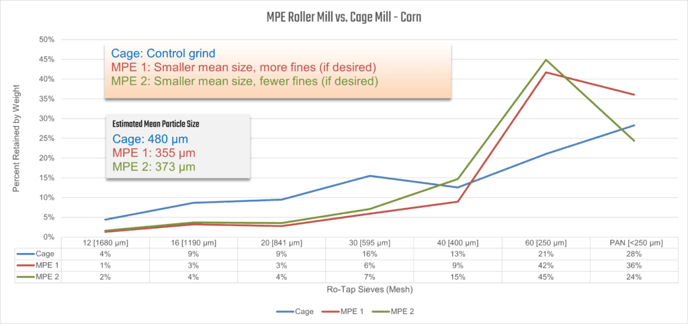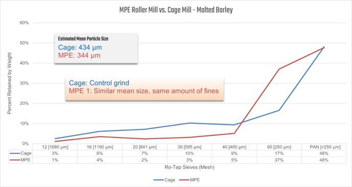 One malted barley sample ground with a cage mill, and one malted barley sample ground with an MPE Gran-U-Lizer.For the above Ro-Tap sample measurement comparison charts, the estimated mean particle size is calculated using particle size midpoints between Sieves. <12 Mesh is assumed 2090 μm. PAN is assumed at 175 μm.