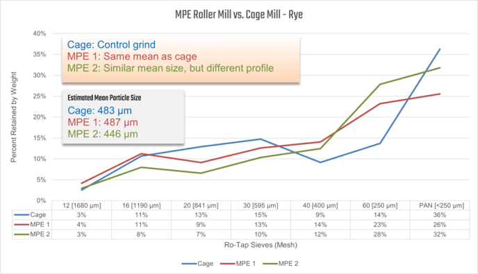 One rye sample ground with a cage mill (control) and two samples ground with an MPE Gran-U-Lizer. Both MPE samples emulate the cage mill grind in mean particle size, with slight changes to the profile depending on desired result.Malted Barley