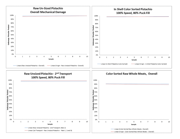 Test data show that mechanical damage after conveyance was less than 1% for both in shell pistachio and pistachio kernels. Test data also shows that virgin product (non-conveyed) itself has up to 1% of product damage plus or minus one standard deviation. Therefore of the less than 1% of product damage, it cannot be attributed to conveyor damage. The same results were found from Chain-Vey 2nd product transport.